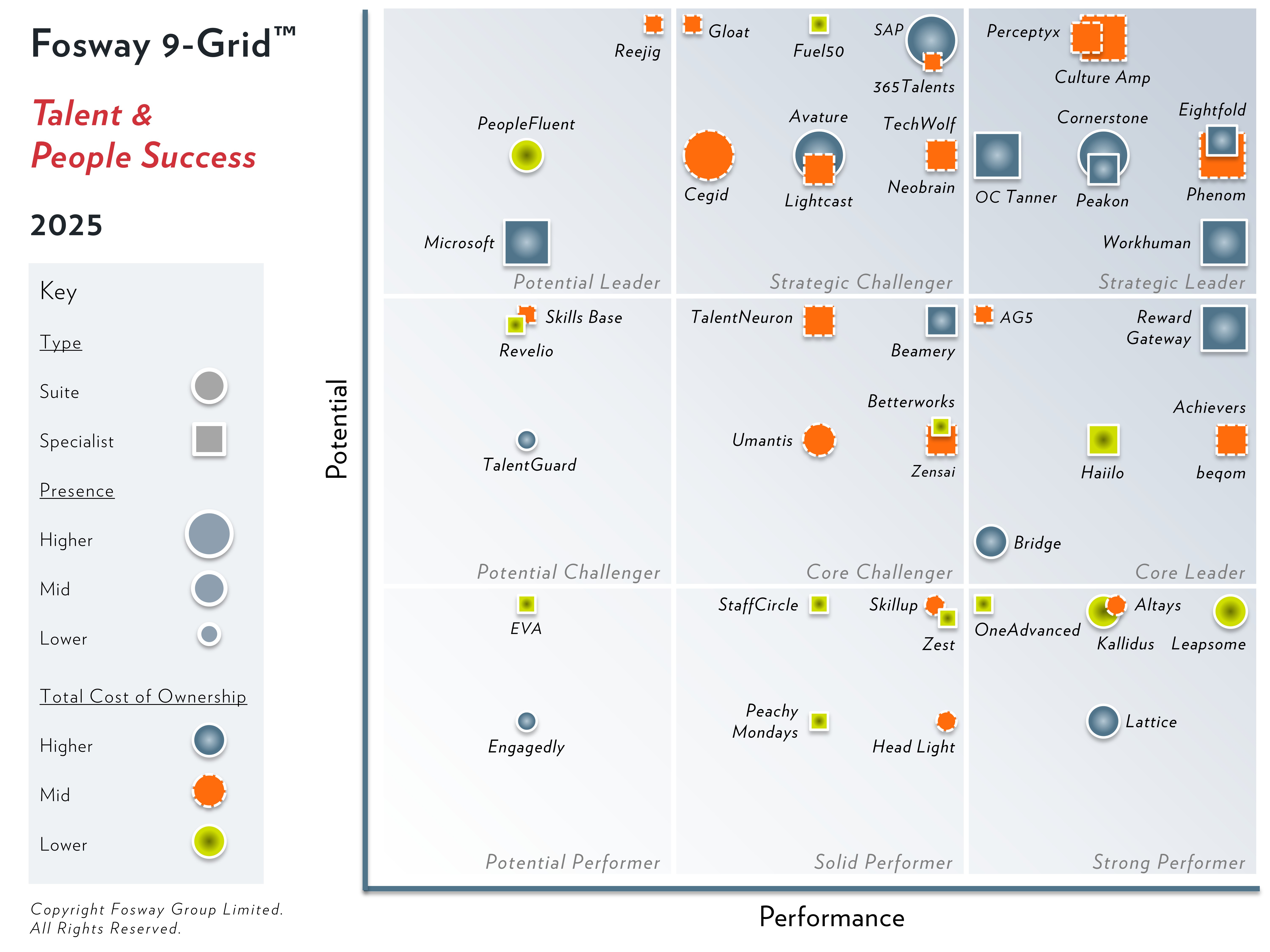 The 2025 Fosway 9-Grid™ for Talent & People Success incorporates both Talent Suites and Specialists. Talent & People Success Suites provide a range of talent functionality, from talent acquisition through to development, performance and employee wellbeing. Specialists provide a more focused set of functionalities within Talent & People Success – for example, focusing on specific topics such as skills, talent mobility, or employee listening.