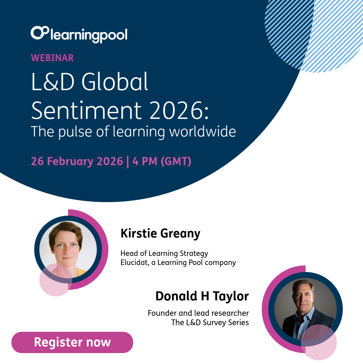 The session brings together Donald H Taylor, founder and lead researcher of the L&D Global Sentiment Survey, and Kirstie Greany, Head of Learning Strategy at Learning Pool, to unpack findings from the 13th year of the survey, alongside insights from Learning Pool’s State of Digital Learning Report 2026.